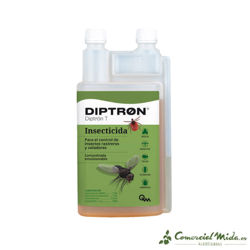 Diptrón T de Quimunsa es un insecticida concentrado de aplicación en ambientes ganaderos, transportes, perreras... Especialmente indicado para eliminar insectos rastreros (arañas, pulgas, cucarachas, garrapatas, piojos, hormigas...) y voladores (moscas, mosquitos...). Este tratamiento es de amplio espectro de acción y se caracteriza por su gran eficacia y persistencia contra insectos rastreros y voladores, incluso contra los insectos resistentes a otros insecticidas tradicionales. En su formulación se combinan un piretroide de amplio espectro con uno de rápido efecto knock down y un sinergista, de esta manera se obtiene un efecto de desalojo que asegurará un ambiente agradable y libre de insectos.