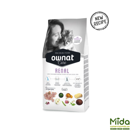 OWNAT Care Renal es una fórmula orientada a gatos adultos con necesidad de control mineral y proteína moderada para reducir la carga renal, destacando niveles bajos de calcio y fósforo, además de sodio y magnesio, coherentes con el posicionamiento renal.