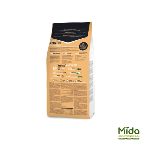 OWNAT Grain Free Hypo Lamb es un alimento para perros formulado sin cereales y con cordero como única fuente de proteína animal, lo que lo convierte en una alternativa adecuada para discriminar alergias e intolerancias mediante dietas de exclusión. Incorpora 50% de cordero fresco, aportando proteínas de alto valor biológico, elevada palatabilidad y un mejor aprovechamiento de nutrientes. Se completa con fuentes alternativas de carbohidratos (patata, mandioca y legumbres), antioxidantes naturales (manzana y arándanos), y componentes funcionales como FOS/MOS, algas marinas y yucca, orientados al soporte digestivo e intestinal.