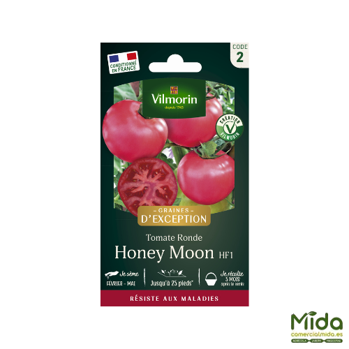 Las semillas de Vilmorin de tomates de honey moon  es una variedad híbrida tipo Rosa de Berna, muy valorada por su excelente resistencia al mildiu —una enfermedad fúngica asociada al calor y la humedad— y por su alta tolerancia frente a otras patologías habituales como la verticilosis o el virus del mosaico. Su planta vigorosa y de gran desarrollo garantiza una producción abundante de tomates de atractivo color rojo rosado, carnosos, jugosos y de sabor excepcional, con un peso aproximado de 300 g, ideales para disfrutar en ensaladas frescas de verano.