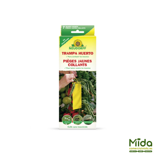 Las Trampa Huerto de Neudorff son ideales para el control de insectos voladores en huertos urbanos, invernaderos o exteriores. Su protección natural hace de esta trampa ecológica y libre de insecticidas una solución excelente frente a plagas de moscas blancas, mosquilla negra del sustrato, minadores de hojas, pulgones, trips e incluso pequeños saltamontes. Cada tira amarilla de 20 cm está hecha en plástico resistente de color amarillo para atraer a los insectos y una cola pegamentosa que captura de forma eficaz al insecto que osa posarse en ella.